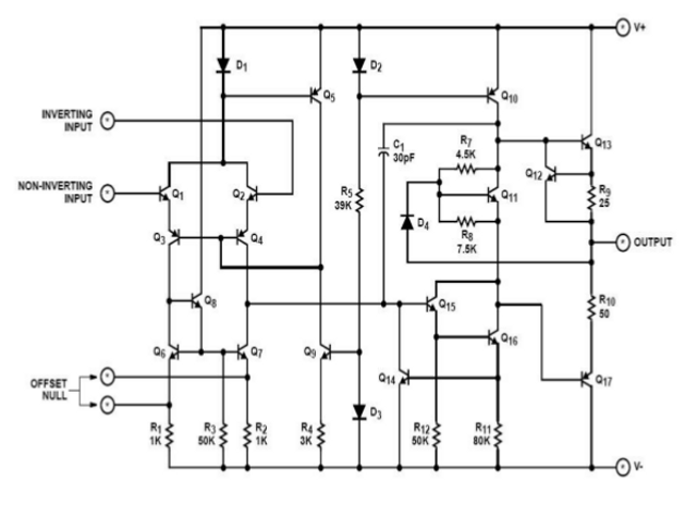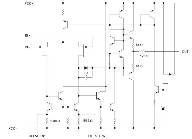 Schemi elettrici degli amplificatori TL081 di Texas e del μA741 di Analog Devices.