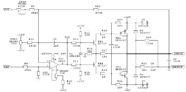 Nel circuito poi troviamo dei diodi, in particolare D1 tipo 1N4148 sostituibile anche con un BAV20. Questo diodo serve a divaricare la polarizzazione di base dei due transistor TR3 e TR4 in questo modo otterremo due cose, la prima è la generazione di una piccola zona morta dove entrambi i transistor di potenza TR1 e TR2 sono spenti e al tempo stesso con un piccola variazione di tensione sull’uscita dell’operazionale OP07 lo stadio inizierà a pilotare il motorino.
